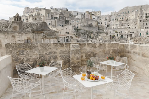Immagini della Dimora di Metello negli ambienti esterni con il contesto dei Sassi di Matera e della reception
